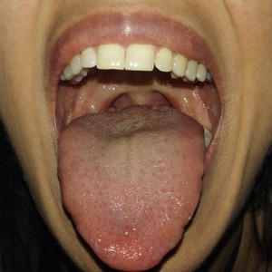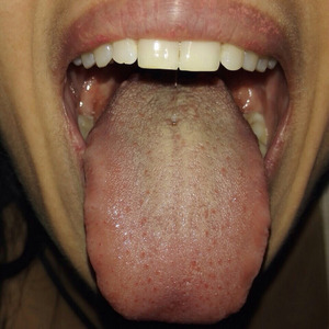 | בתמונה קצה לשון מחודד ונוטה כלפי מעלה עם אדמומיות בקצה – מסמן על מתח ואי שקט נפשי – צדדי הלשון אדומים יותר משאר הלשון וחסר חיפוי - מצביע על חוסרים בכבד. בנוסף באזור האחרי של הלשון ישנה צורת גל שוקע המצביע על בעיה בגב התחתון ומושך את רגל שמאל. המטופלת התלוננה על כאבי ראש,מתחים וכעסים, כאבי גב תחתון,עייפות קושי להרדם וצרבת. |