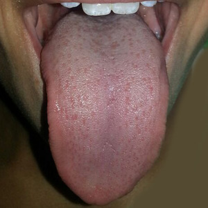 | המטופל ילד כבן 12 הגיע אלינו עם הפרעת קשב וריכוז, התנהגות מוגזמת,אגרסיבי ותוקפני,ילד שאינו יכול לשבת בכיתה מרטיב בלילה,נשלח לטיפול פסכיאטרי כולל טיפול תרופתי.בתמונה אנו רואים לשון דחוסה(צר בצדדים), טיפ של לשון צר ומחודד, וצניחת האחורית של הלשון. טיפ לשון מחודד וצניחת לשון אחורית אלו הסימנים המצביעים על הפרעת קשב וריכוז. |